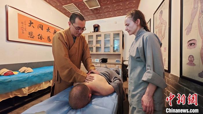 5月16日,河南登封,少林藥局負責人向弗謝米爾諾娃·斯韋特蘭(lan) 娜傳(chuan) 授少林推拿要領。 中新社記者 李超慶 攝