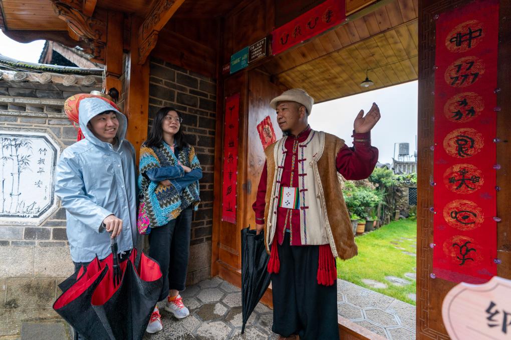 雲(yun) 南省麗(li) 江市玉龍納西族自治縣白沙鎮玉湖村村民和傑林(右)為(wei) 來自北京的遊客介紹納西族東(dong) 巴文(2023年8月28日攝)。新華社記者 陳欣波 攝