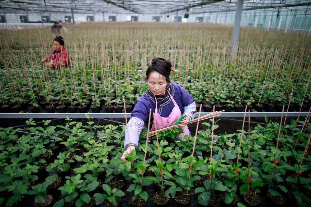 在貴州省榕江縣車江壩區智慧育苗中心內(nei) ,一名少數民族婦女在大棚內(nei) 對百香果苗進行管理(2023年2月28日攝)。新華社記者 劉續 攝