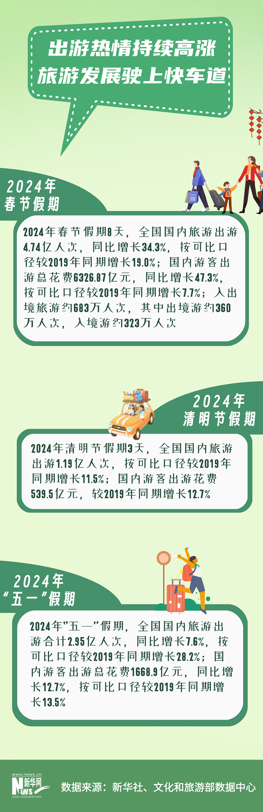 2024年春節假期8天,全國國內(nei) 旅遊出遊4.74億(yi) 人次;清明節假期3天,全國國內(nei) 旅遊出遊1.19億(yi) 人次;“五一”假期全國國內(nei) 旅遊出遊2.95億(yi) 人次......