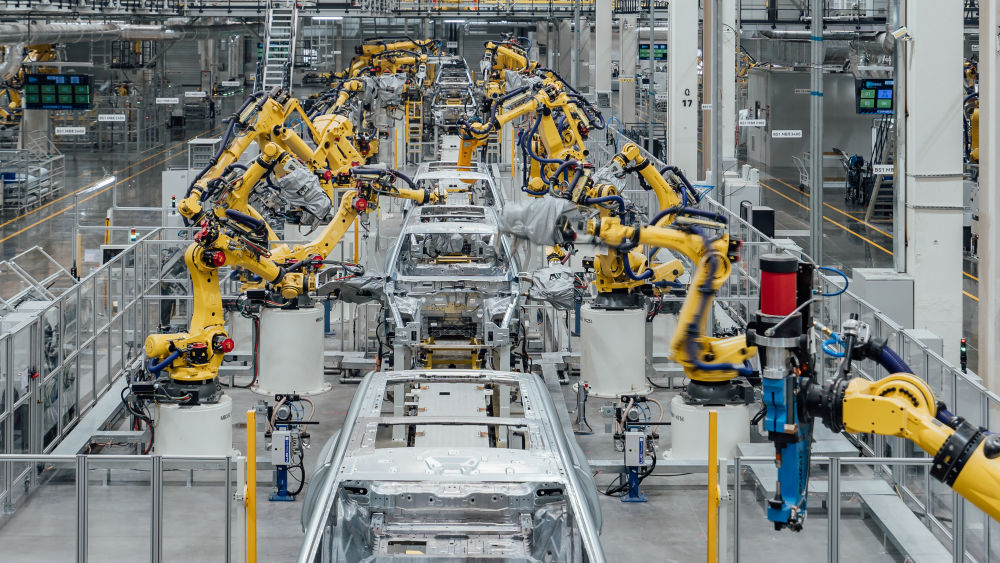 這是在重慶市兩(liang) 江新區拍攝的賽力斯汽車超級工廠焊裝車間生產(chan) 線(2024年2月26日攝,無人機照片)。新華社發(高彰 攝)