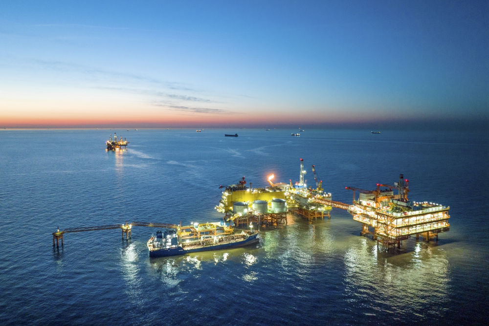 這是2024年1月25日拍攝的埕北油田全景(無人機照片)。當日,位於(yu) 渤海灣西南部的埕北油田油氣處理與(yu) 岸電設備共建平台——CEPC(中心平台)正式投產(chan) ,該平台可使油田接入來自陸地的綠色電力,減少海上“自發電”帶來的天然氣和原油消耗。新華社發(杜鵬輝攝)