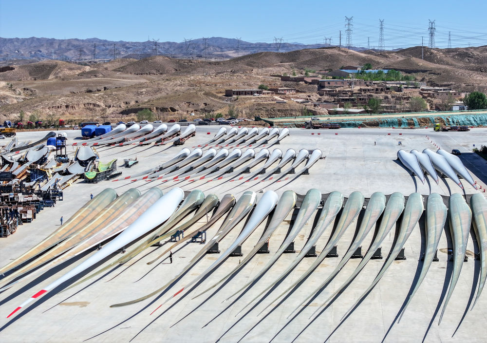2024年5月11日拍攝的碼放在內(nei) 蒙古包頭市石拐區一家風電設備製造企業(ye) 廠區內(nei) 的葉片(無人機照片)。