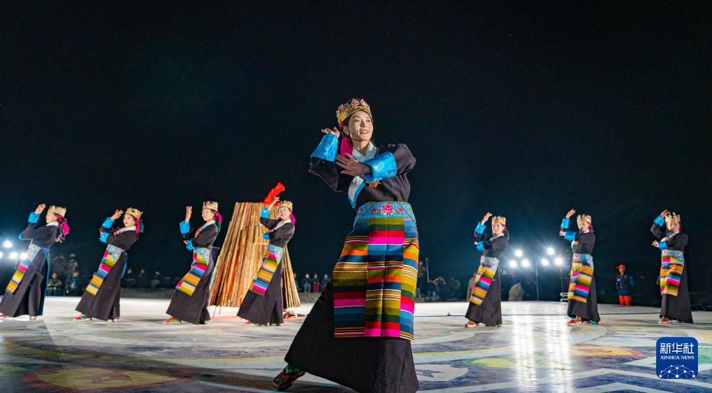舞蹈演員在納木錯開湖篝火晚會(hui) 現場表演(5月18日攝)。