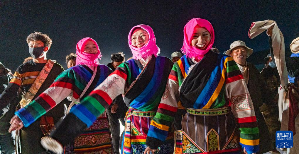 當地群眾(zhong) 在納木錯開湖篝火晚會(hui) 現場跳鍋莊(5月18日攝)。