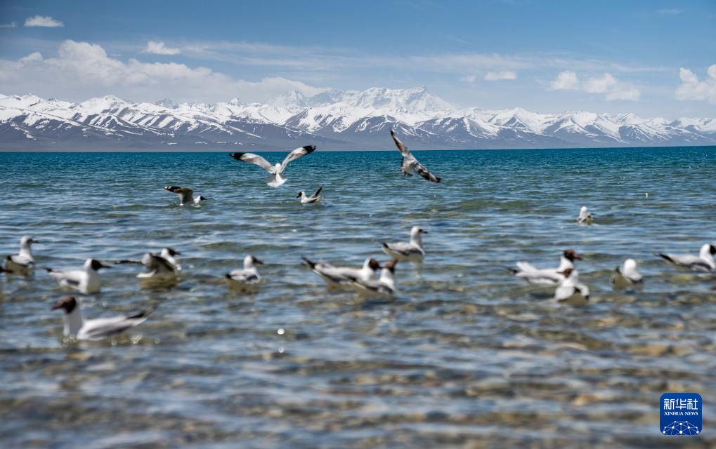 一群棕頭鷗在冰雪消融的納木錯湖麵停留(5月19日攝)。