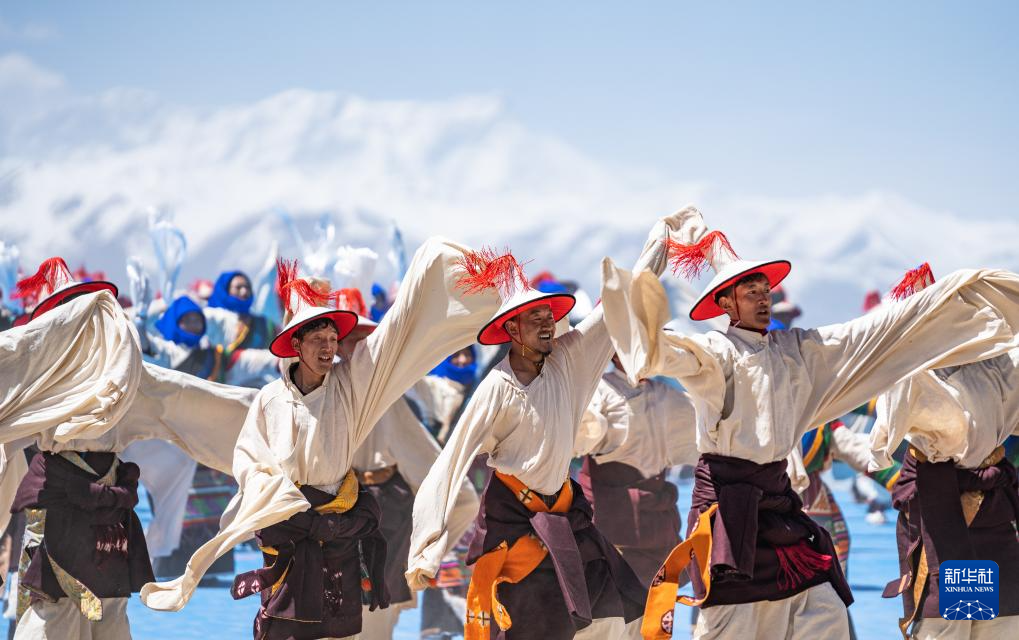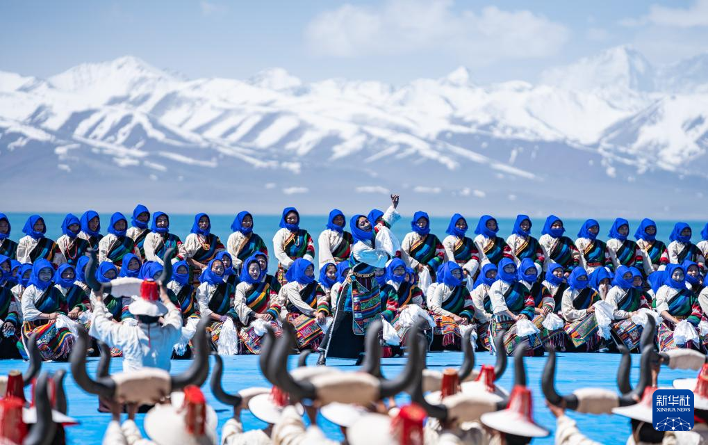 舞蹈演員在納木錯開湖活動現場表演(5月19日攝)。