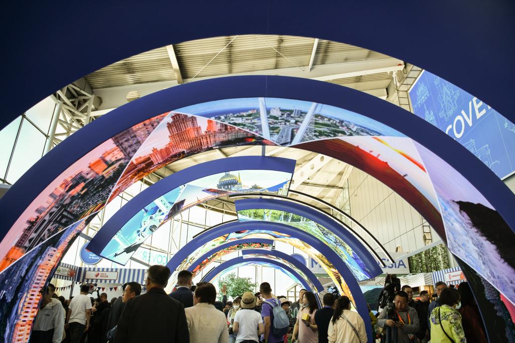5月18日,參會(hui) 者走進在哈爾濱國際會(hui) 展中心舉(ju) 行的第八屆中俄博覽會(hui) 展館。新華社記者 王鬆 攝
