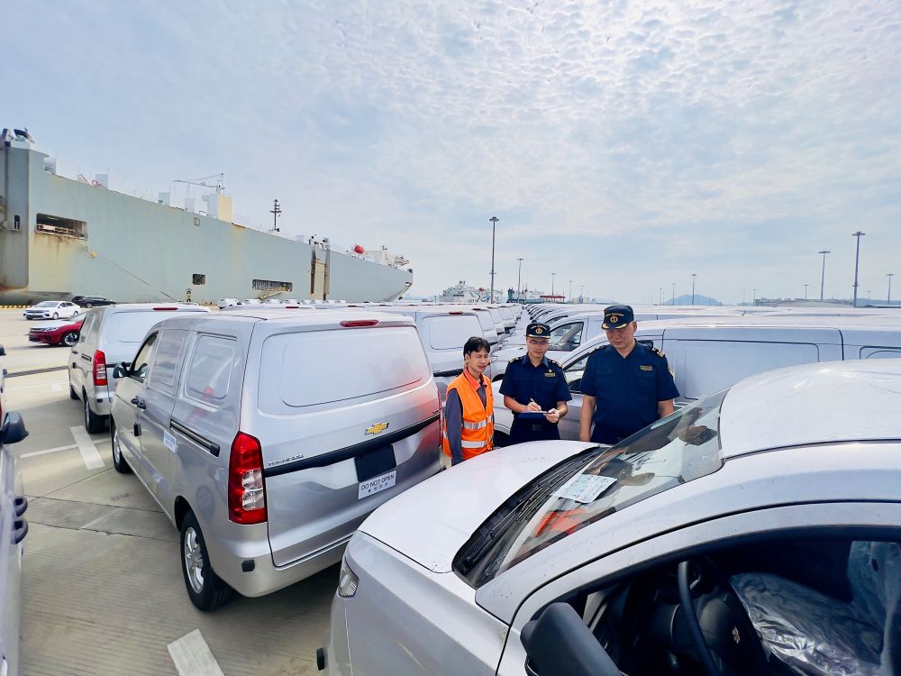 廣州海關(guan) 所屬南沙海關(guan) 關(guan) 員對出口汽車進行監管。(受訪者供圖)
