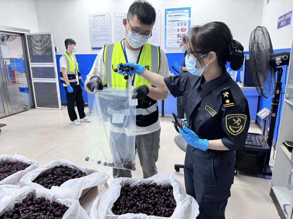 廣州白雲(yun) 機場海關(guan) 關(guan) 員對新產(chan) 季進口車厘子進行監管。(受訪者供圖)