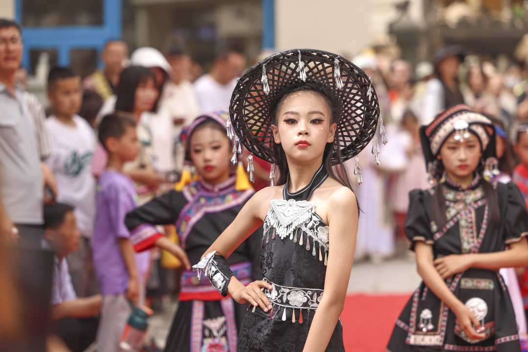 2024年5月19日,演員在庫車市龜茲(zi) 小巷為(wei) 遊客表演模特秀。袁歡歡攝(中經視覺)