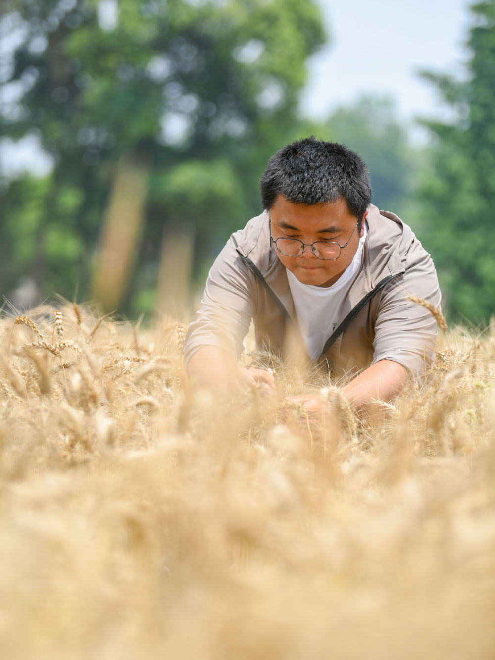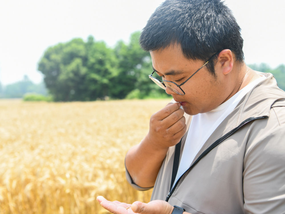 在四川成都崇州市三江街道古泉村,舒星宇在麥田裏查看小麥成熟情況(5月15日攝)。