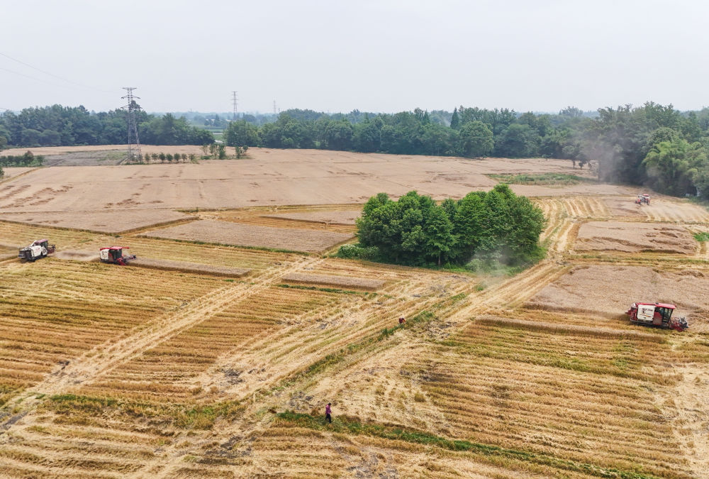 在四川成都崇州市三江街道古泉村,收割機在麥田裏收割小麥(5月15日攝)。