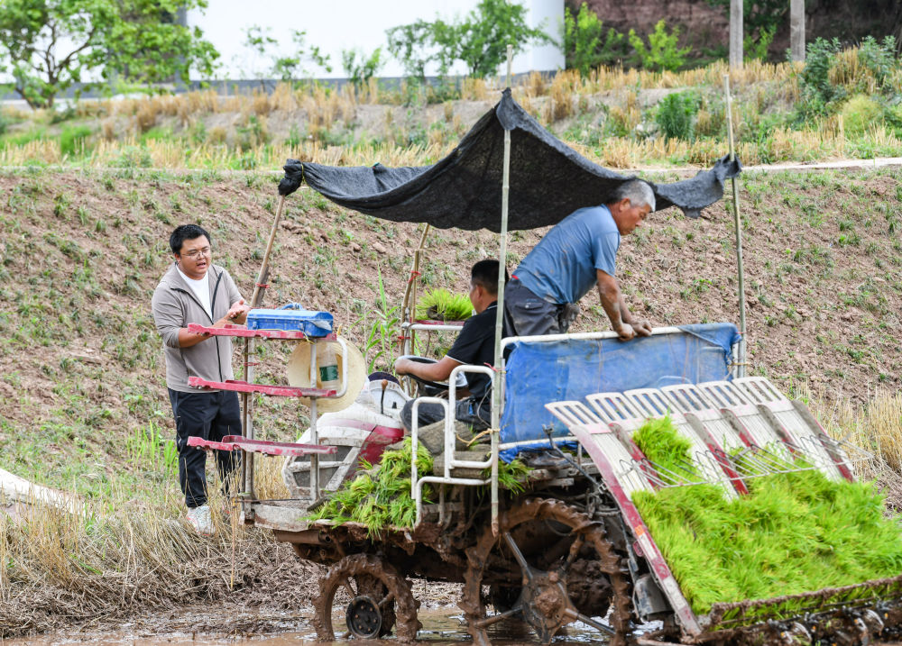 在四川成都東(dong) 部新區董家埂鎮小河村,舒星宇(左)在和插秧機手溝通機插秧的注意事項(5月15日攝)。