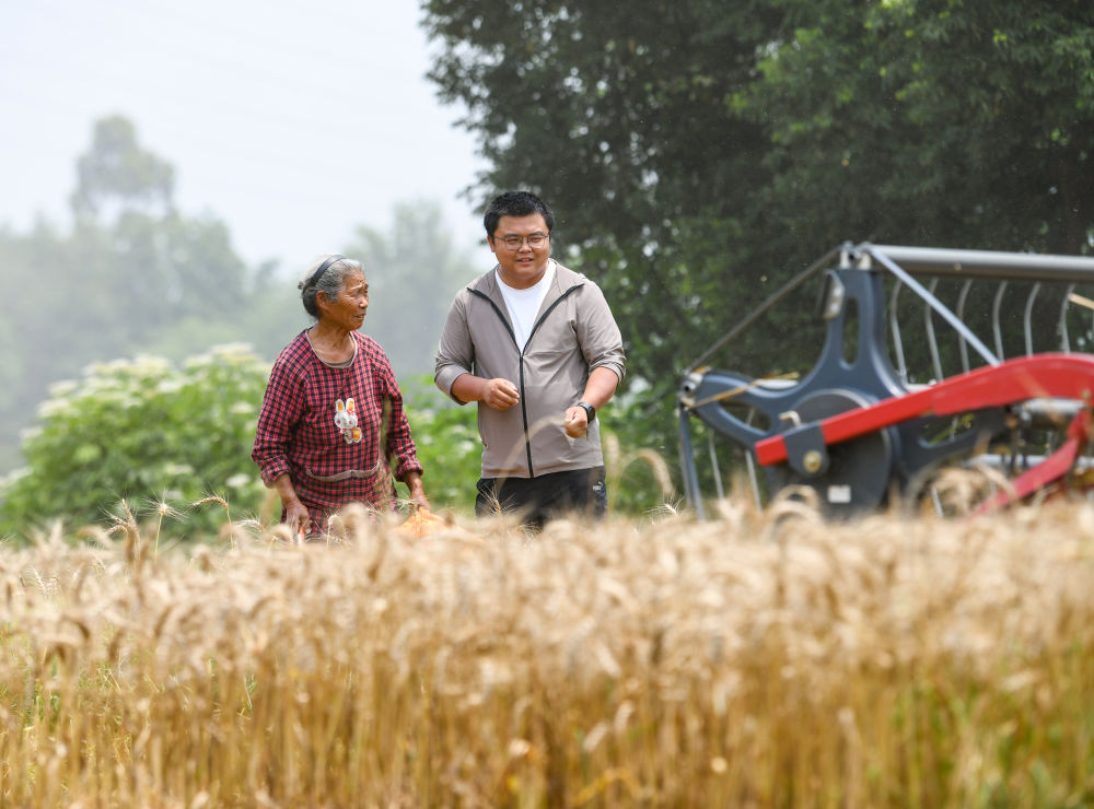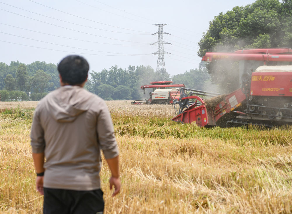 在四川成都崇州市三江街道古泉村,舒星宇在麥田邊觀看小麥收割機作業(ye) (5月15日攝)。