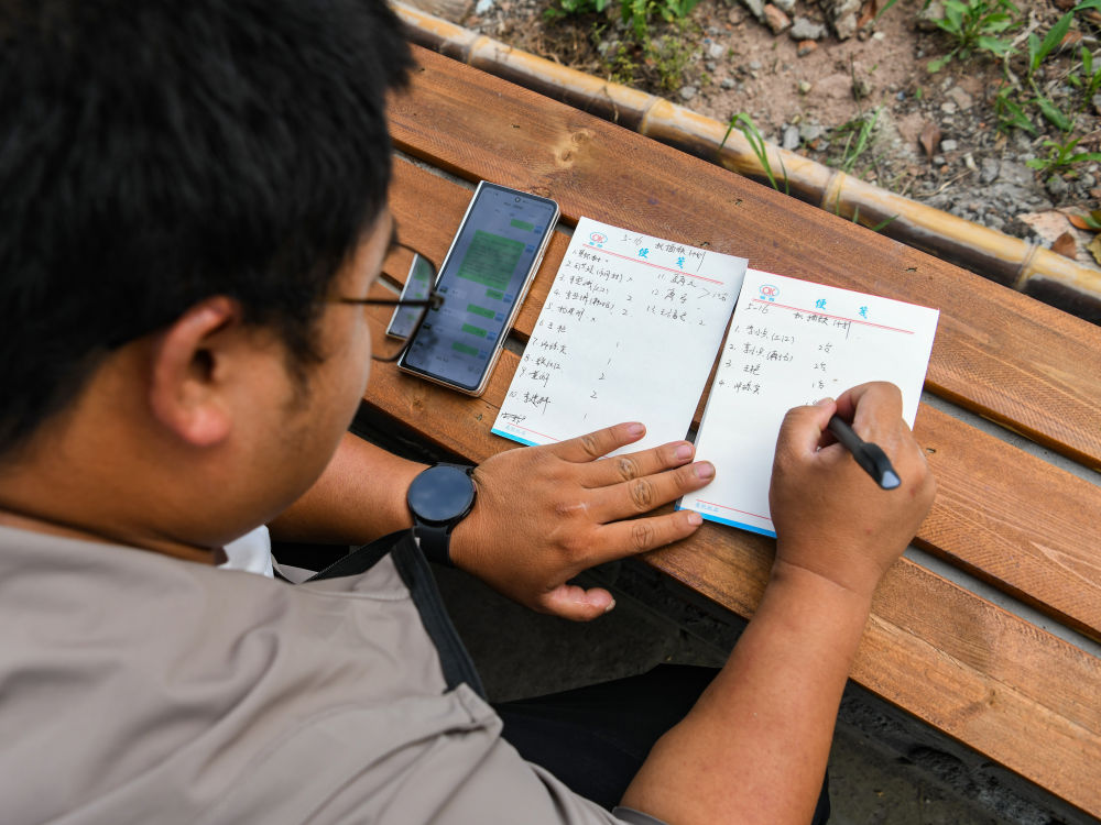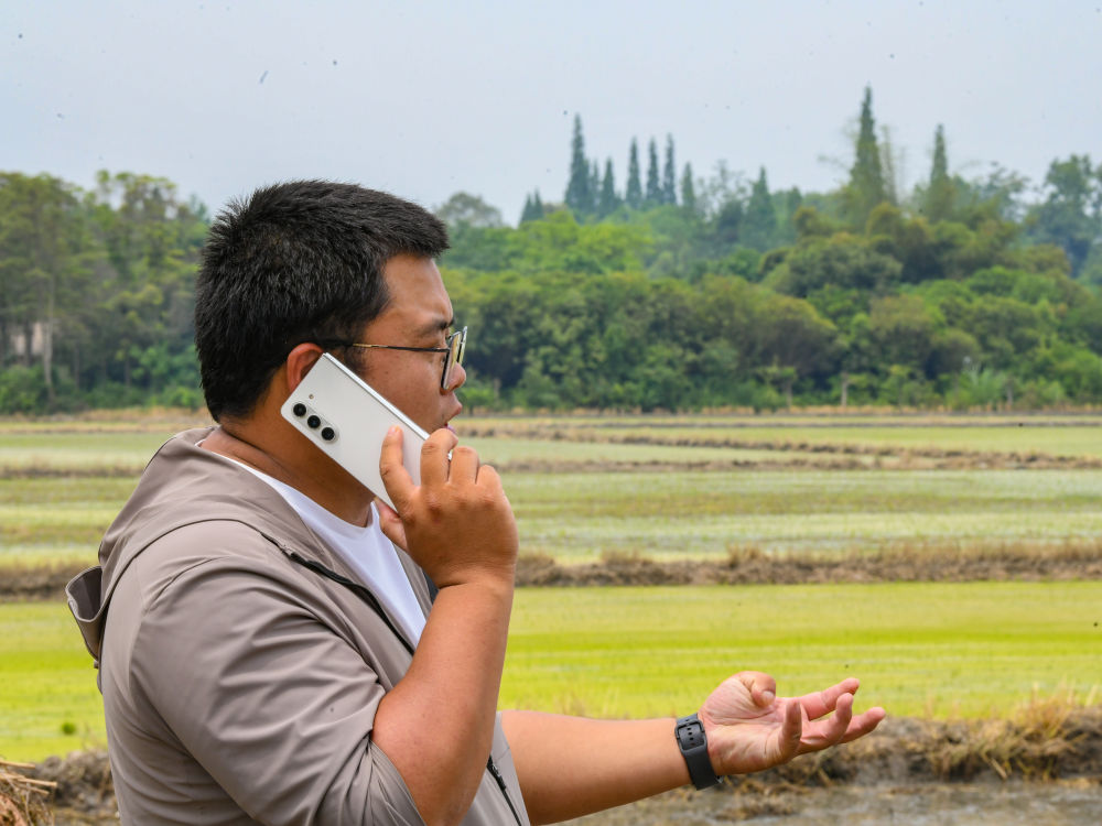 在四川成都崇州市大劃街道石橋村,舒星宇接到種植大戶的電話,溝通農(nong) 機服務需求(5月15日攝)。