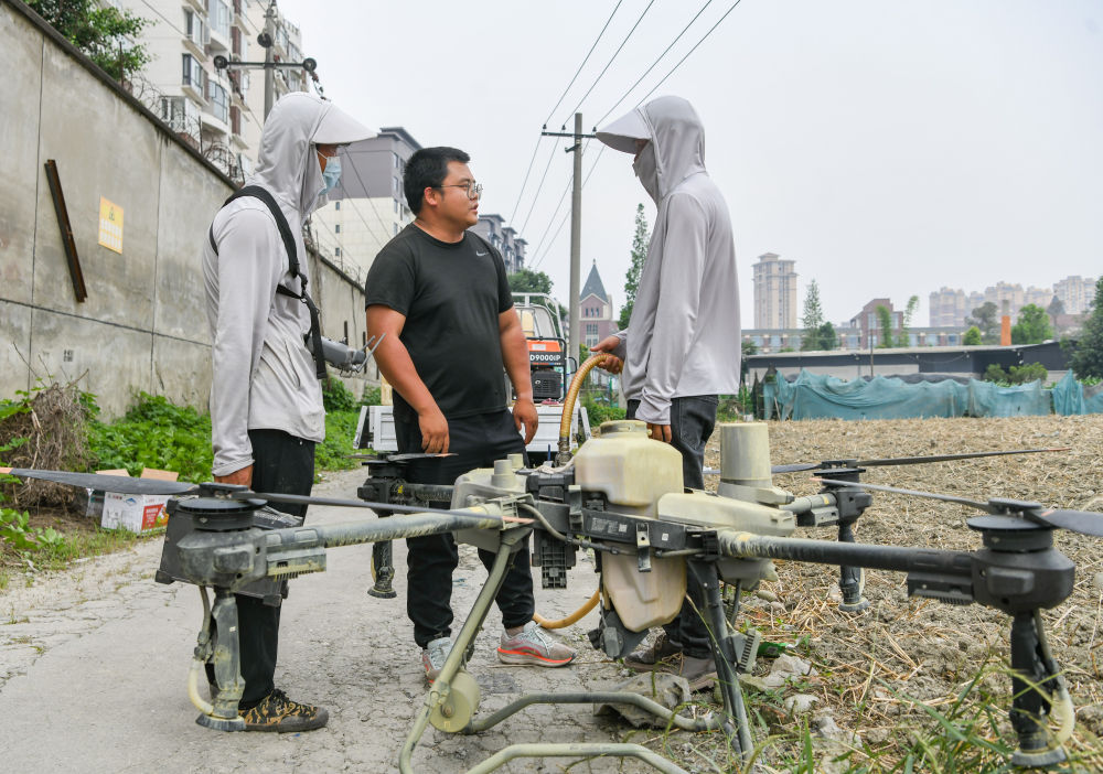 在四川成都溫江區萬(wan) 春鎮,舒星宇(中)和植保無人機飛手在溝通當天打藥的區域和作業(ye) 時間(5月16日攝)。