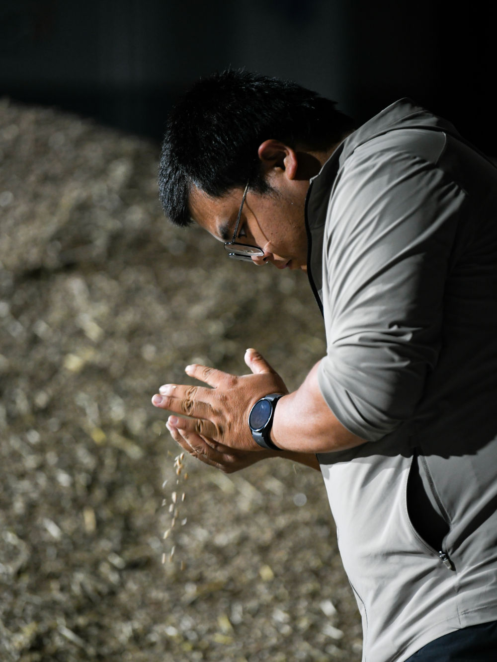 在四川成都崇州市萬(wan) 茂欣欣農(nong) 機專(zhuan) 業(ye) 合作社,舒星宇在查看庫房待烘幹小麥的情況(5月15日攝)。