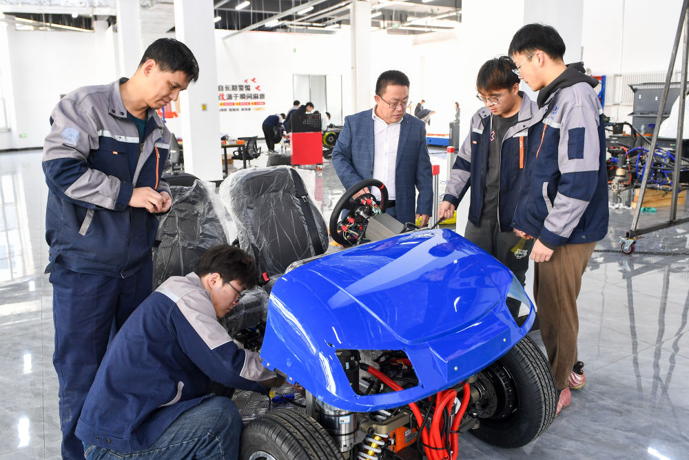 2024年3月13日,長春市麥迪克智行汽車科技有限公司,吉林大學汽車工程學院教授靳立強(右三)與(yu) 同事檢查智能底盤樣車。新華社記者 張楠 攝