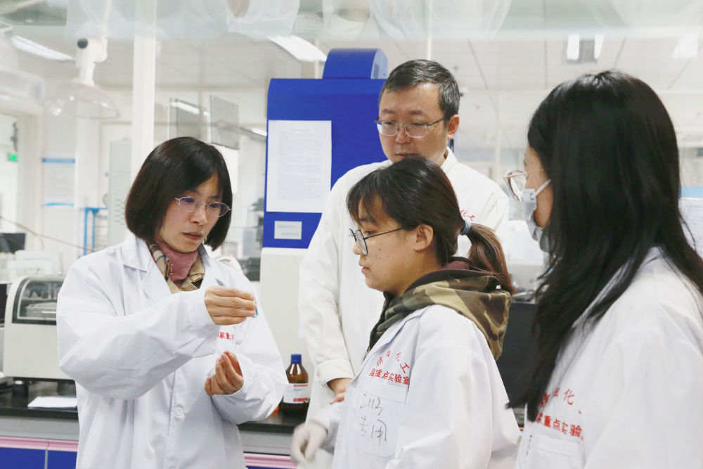 大連理工大學化工學院樊江莉(左)教授與(yu) 同事及學生查看實驗結果(2021年11月攝)。新華社發