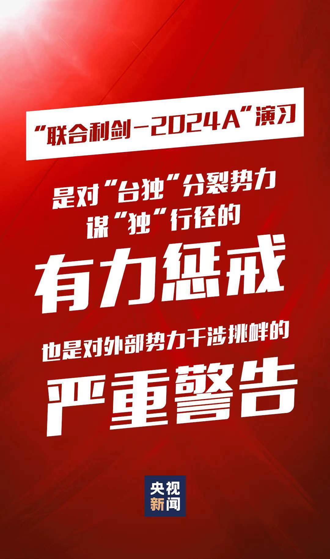 5月23日至24日,中國人民解放軍(jun) 東(dong) 部戰區組織戰區陸軍(jun) 、海軍(jun) 、空軍(jun) 、火箭軍(jun) 等兵力,位台島周邊開展“聯合利劍-2024A”演習(xi) ,重點演練聯合海空戰備警巡、聯合奪取戰場綜合控製權、聯合精打要害目標等科目,艦機抵近台島周邊戰巡,島鏈內(nei) 外一體(ti) 聯動,檢驗戰區部隊聯合作戰實戰能力。這是中國維護國家主權和領土完整的正義(yi) 之舉(ju) ,也是對“台獨”分裂勢力謀“獨”行徑的有力懲戒,對外部勢力幹涉挑釁的嚴(yan) 重警告。