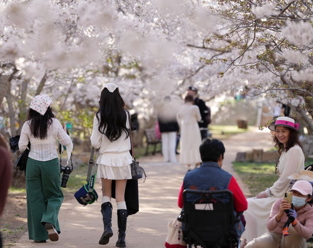 2024年4月17日,遊客在遼寧省大連市龍王塘櫻花園內(nei) 賞花、遊覽。 新華社記者 李鋼 攝