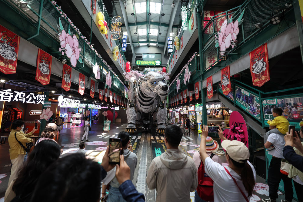 大連熊洞街,當身高6米、重達25噸,灰色的仿生機械巨熊時而張口咆哮,時而緩緩前行,遊客爆發出陣陣歡呼。大連冰山慧穀發展有限公司總經理助理藍費靜說:“這一街區由擁有近百年曆史的大連冰山集團舊址改造而來,現已匯聚上百家遊樂(le) 、電玩、研學商戶,老廠房煥發了新生機。”