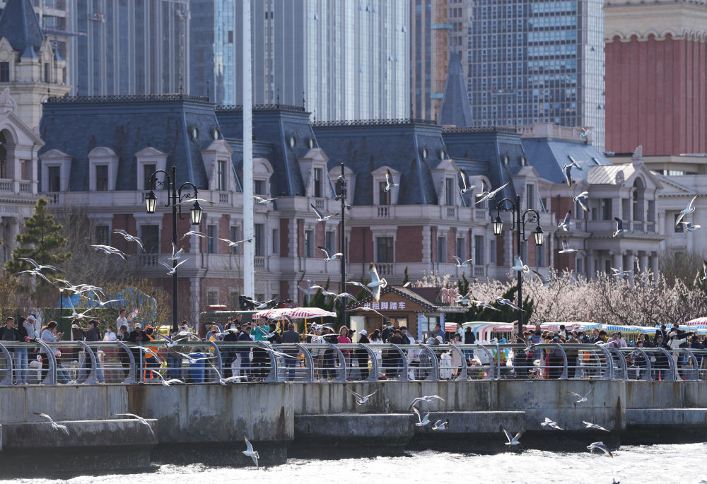 2024年4月16日,在遼寧省大連市東(dong) 港商務區,遊客在海邊休閑觀光。 新華社記者 李鋼 攝