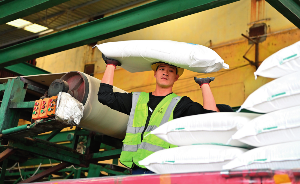 工作人員在廣西來賓小平陽湘桂製糖有限公司將白糖裝車(2023年12月12日攝)周華攝