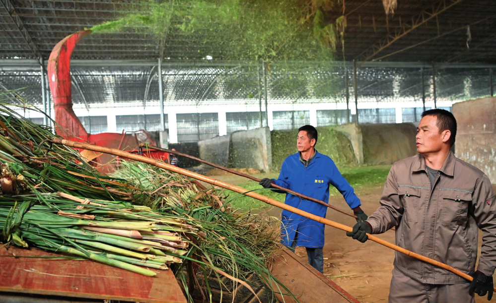 工作人員在廣西來賓市興(xing) 賓區大灣鎮雙誠牧業(ye) 有限公司粉碎甘蔗尾葉,準備製作牛飼料(2023年12月13日攝)周華攝