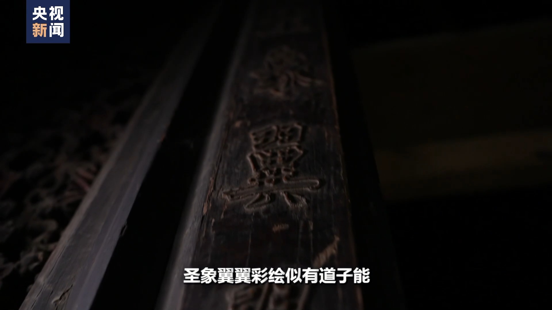 那麽(me) 剛才提到楹聯裏頭的下楹聯叫聖象翼翼彩繪似有道子能,它主要說這裏的油漆彩畫也是非常精美,就像畫聖吳道子親(qin) 自繪畫的技能一樣的精美。