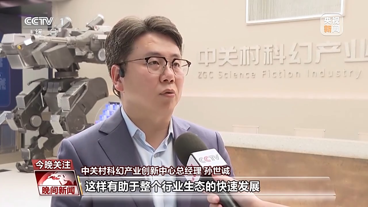 中關(guan) 村科幻產(chan) 業(ye) 創新中心總經理 孫世誠:幫助企業(ye) 把它的技術能夠快速地產(chan) 品化和公共化,有助於(yu) 整個(ge) 行業(ye) 生態的快速發展,2023年,科幻產(chan) 業(ye) 創新中心的產(chan) 值大概是六個(ge) 億(yi) 。