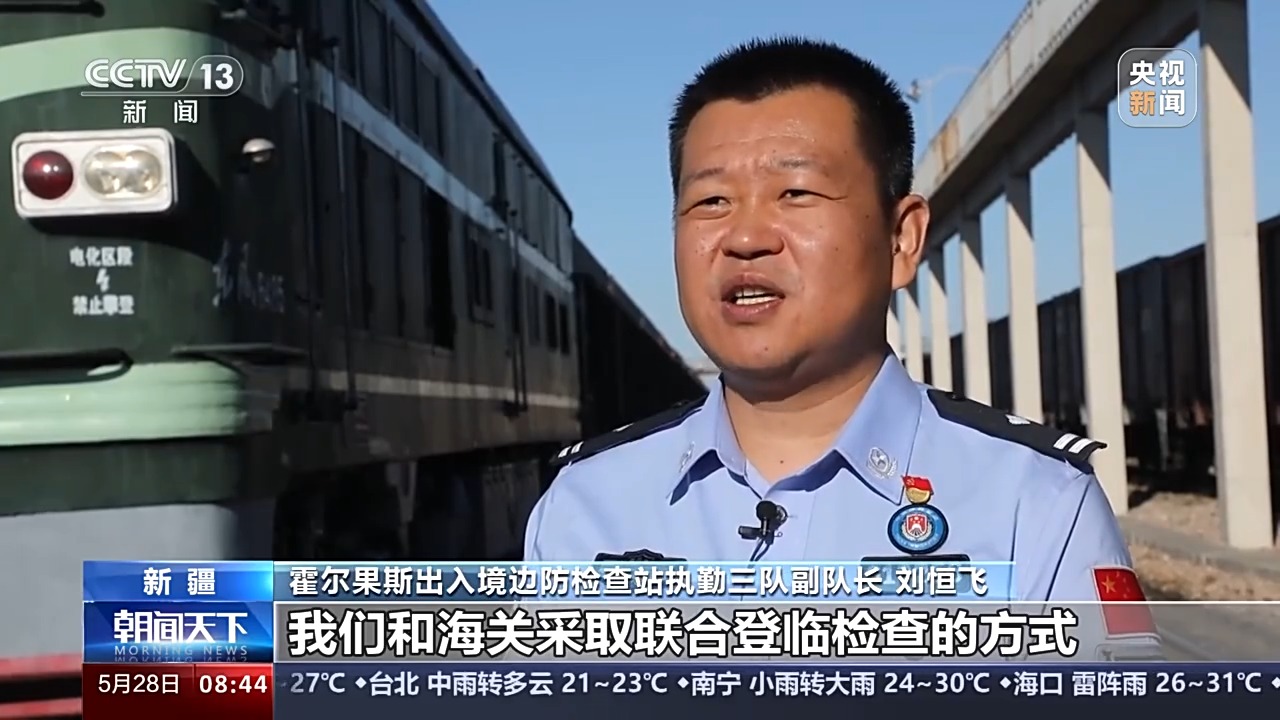 霍爾果斯出入境邊防檢查站執勤三隊副隊長 劉恒飛:我們(men) 和海關(guan) 采取聯合登臨(lin) 檢查的方式對班列車體(ti) 進行檢查,查驗出入境司乘人員和貨物基本是同步進行,30分鍾內(nei) 即可完成查驗。