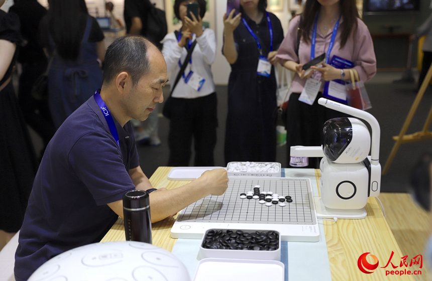 遼寧展區,仿生互動人型機甲龍王“敖寶”吸引觀眾(zhong) 拍照、互動。人民網 劉森君攝