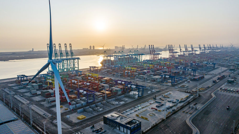 看似平常的碼頭作業(ye) ,背後卻另有玄機——整個(ge) 過程達到了“零碳”排放。2021年底,隨著兩(liang) 台風機葉片緩緩啟動,這座全球首個(ge) “智慧零碳”碼頭的智慧綠色能源係統開始並網發電,通過風電、光伏發出的綠色能源,源源不斷為(wei) 碼頭生產(chan) 提供能源。