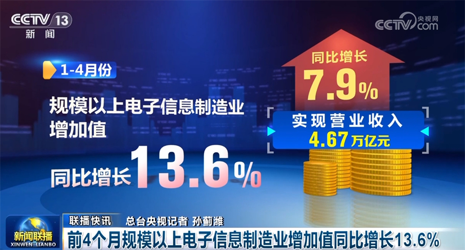 前4個(ge) 月規模以上電子信息製造業(ye) 增加值同比增長13.6%