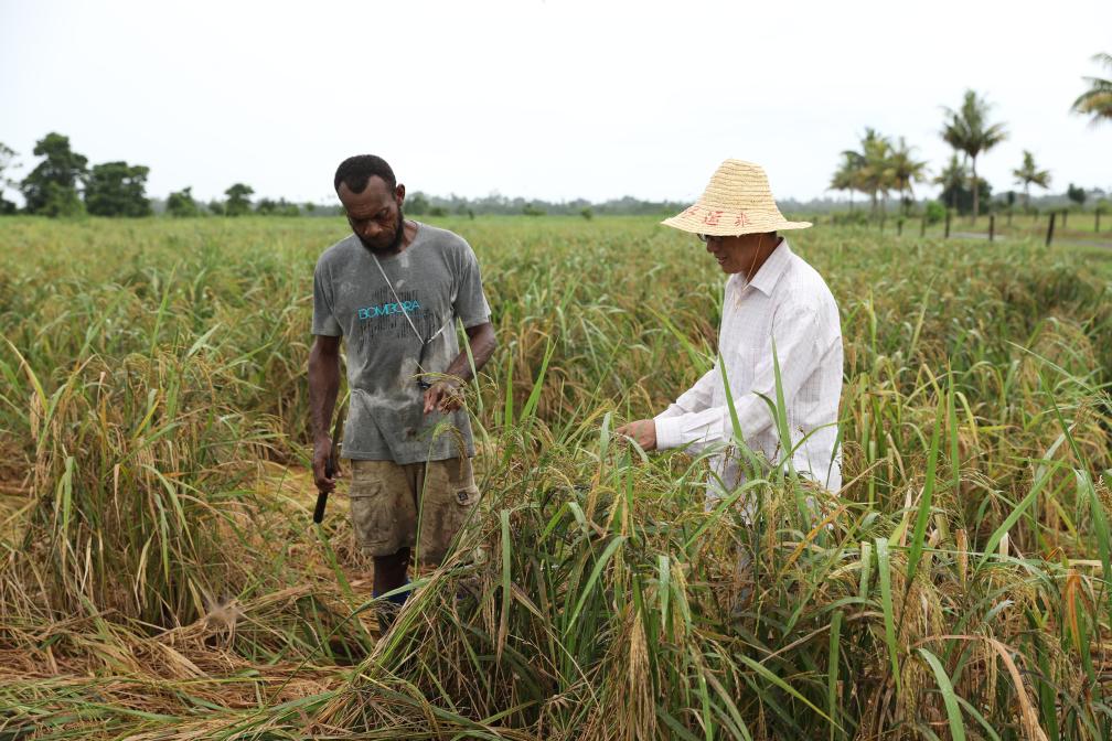 3月13日,在太平洋島國斐濟瑙索裏鎮,中國專(zhuan) 家(右)在中國援斐濟農(nong) 業(ye) 發展技術水稻項目試驗示範培訓基地查看暴雨過後水稻倒伏情況。新華社發(桑欽龍攝)