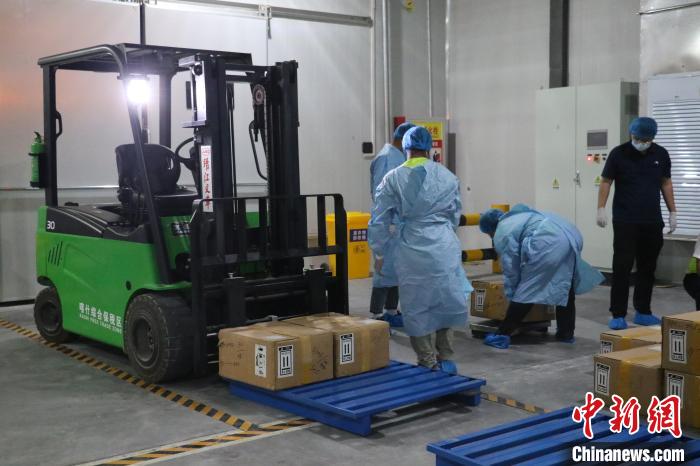 來自巴基斯坦的冰鮮水產(chan) 品從(cong) 喀什航空口岸入境,經查驗後入庫綜合性指定監管場地。方禮 攝