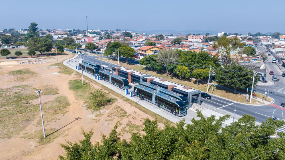 這是2023年7月12日在巴西聖保羅州聖若澤杜斯坎普斯快速公交係統“綠線”始發站拍攝的比亞(ya) 迪純電動大巴(無人機照片)。新華社記者王天聰攝