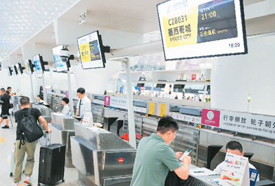 在廣東(dong) 深圳寶安國際機場,搭乘深圳—墨西哥城直飛航線的乘客辦理值機。