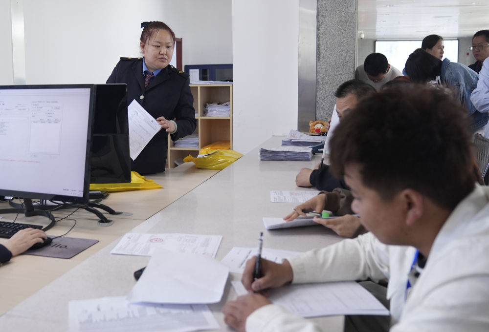 在霍爾果斯鐵路口岸站聯運大廳內(nei) ,出口貨運員在為(wei) 客戶辦理更正國際聯運運單業(ye) 務(5月29日攝)。