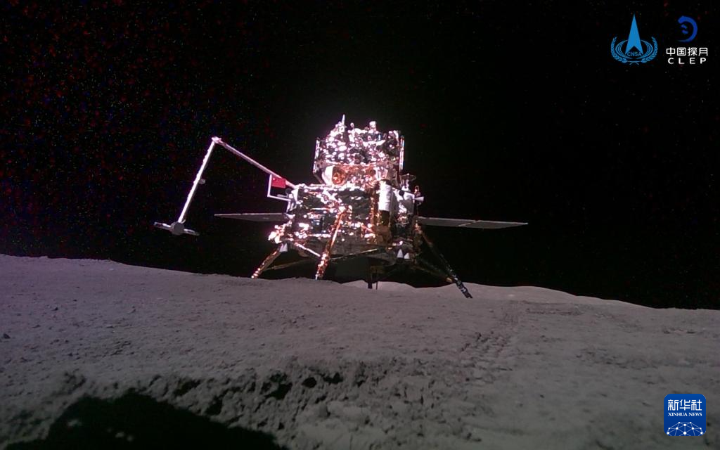 6月3日,嫦娥六號攜帶的“移動相機”自主移動後拍攝並回傳(chuan) 的著陸器和上升器合影。新華社發(國家航天局供圖)
