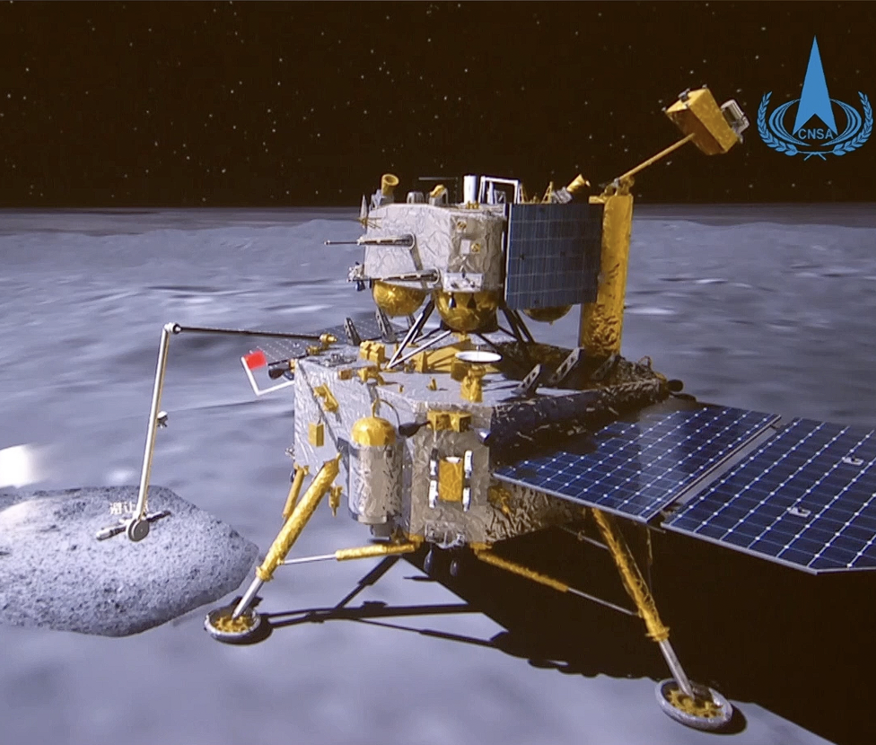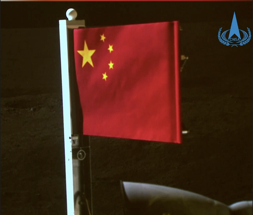 6月4日,五星紅旗在落在月背的嫦娥六號探測器上展開。鮮豔的五星紅旗再次閃耀月球,這是中國首次在月球背麵獨立動態展示國旗。