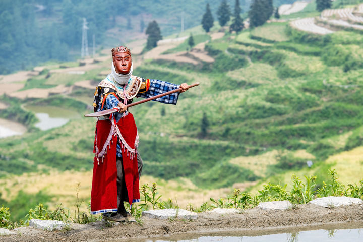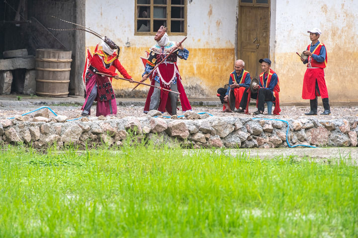 又是一年武陵山間水稻插秧季。在重慶市酉陽土家族苗族自治縣銅鼓鎮清泉村,水稻田間時時回響著極具地方特色的戲曲唱段,一群特別的非遺技藝陽戲(酉陽土家麵具陽戲)表演者,往來於(yu) 田間地頭。他們(men) 忙時翻土培秧,準備著水稻插秧,閑時則舞槍弄劍,排演著表演劇目。