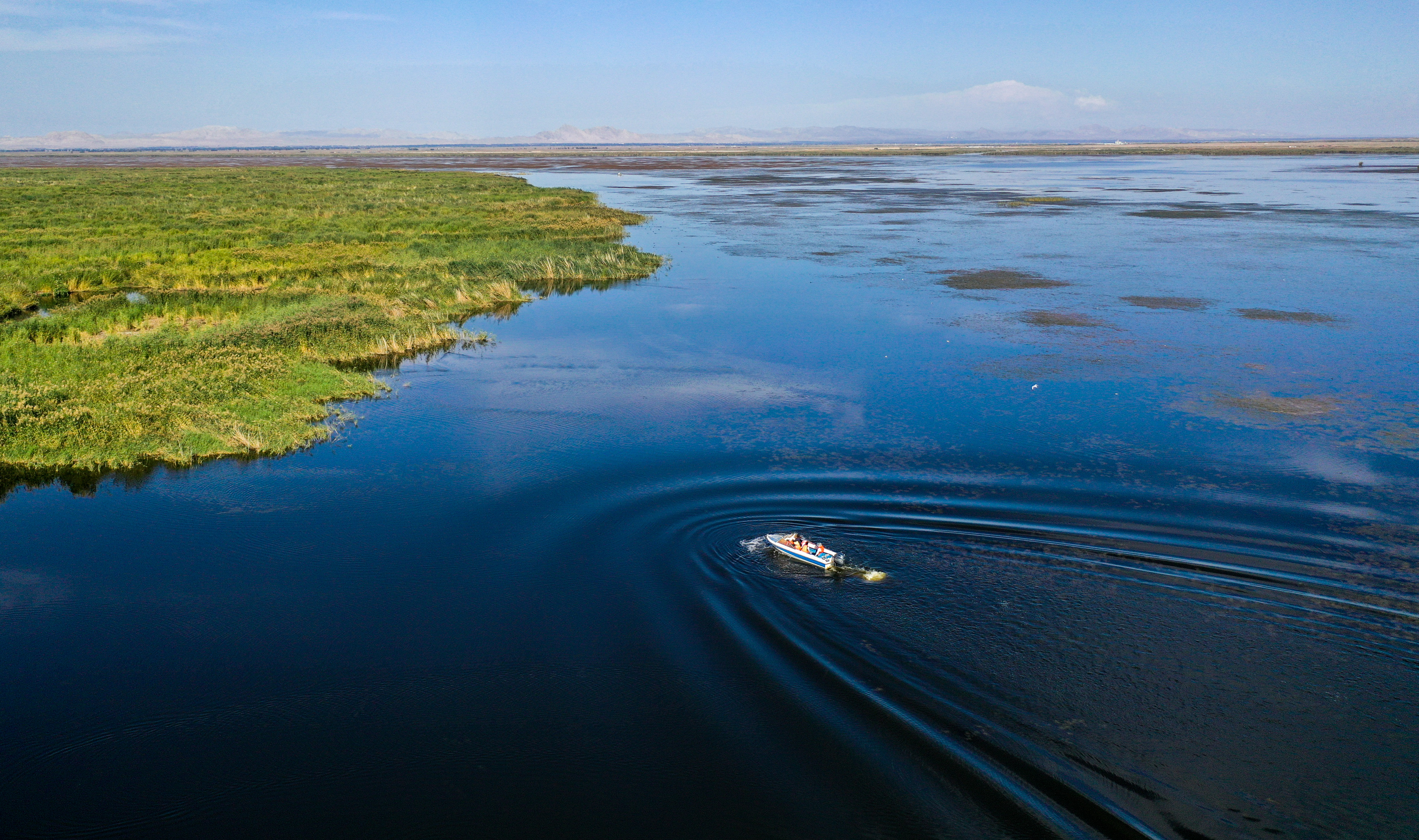 內(nei) 蒙古烏(wu) 梁素海湖麵上,河湖濕地水環境保護與(yu) 修複技術研究團隊成員乘坐快艇去采集湖水樣本(2023年9月15日攝,無人機照片)。新華社記者 連振 攝
