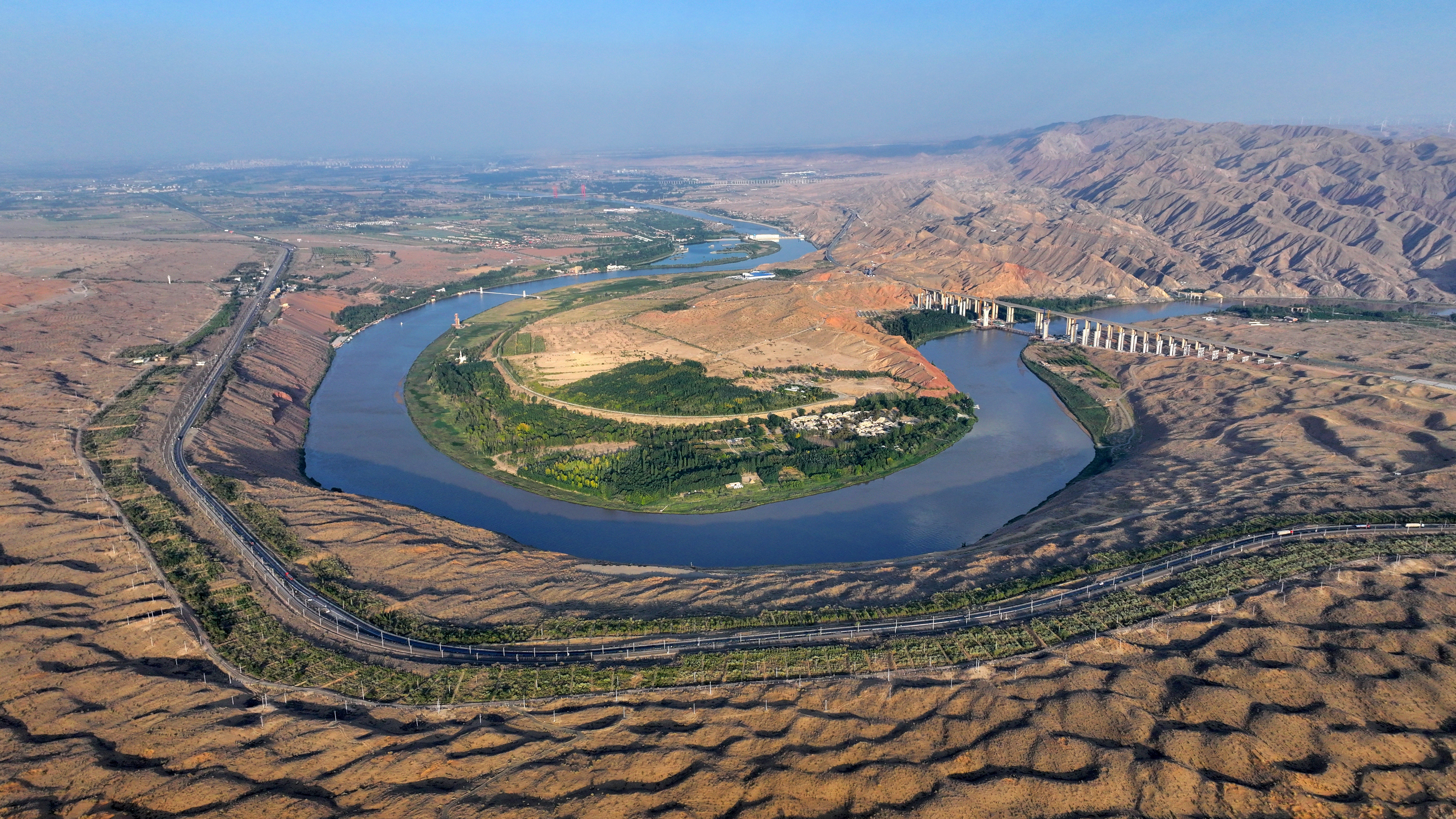 如今,在當地有關(guan) 部門開展的水係疏浚工程影響下,這裏成為(wei) 沙漠濕地的聚集地。黃河流經此地,畫出了一道蜿蜒的曲線。河的一頭是騰格裏沙漠的無垠瀚海,另一頭被一抹蒼翠鑲嵌在河岸邊。