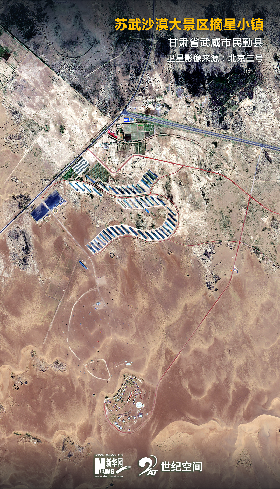 這是甘肅省民勤縣沙漠腹地的“摘星小鎮”(2021年3月4日攝,無人機照片)。新華社記者 郎兵兵 攝