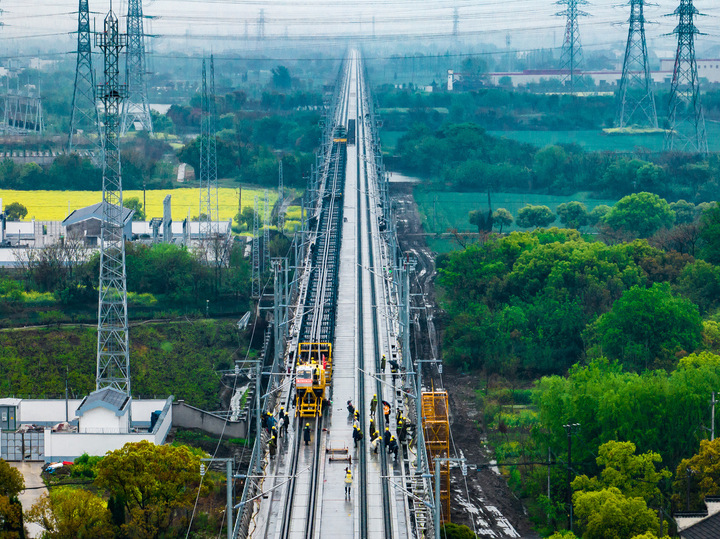 2024年4月7日,滬蘇湖鐵路鋪軌進入湖州吳興(xing) 段。拍友 閔峰 攝