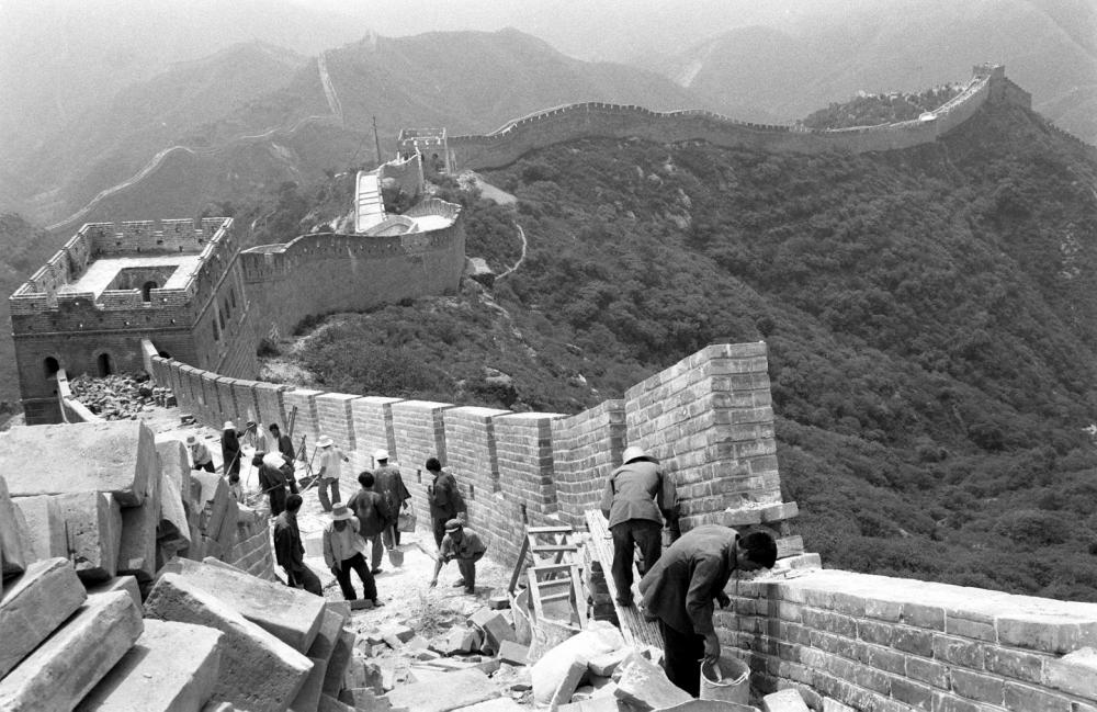 工人正在修複北京八達嶺長城的一段城牆。這是用由北京晚報、八達嶺特區辦事處等單位聯合發起“愛我中華 修我長城”社會(hui) 讚助活動所獲款項進行修複的第一期工程 (資料照片,1984年8月11日發)。新華社記者 袁汝遜 攝