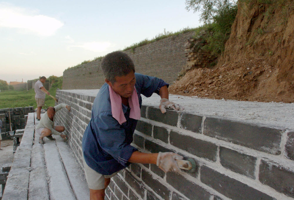 古建工人在修複山海關(guan) 古城城牆(2005年8月29日攝)。新華社發